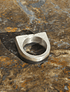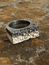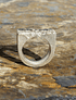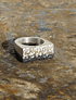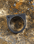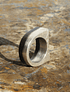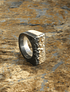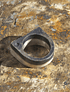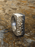 Este anillo, es de plata fina aleación 950, fabricado a mano, con la técnica ancestral de Fundición a la tierra, logrando texturas maravillosas en la pieza de Joyería, luego se patino la mitad del anillo hacia el negro.