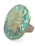 Este Anillo es de cobre y bronce, la pieza principal es de bronce y se patino con dos patinas diferentes, logrando dibujar con patinas diferentes, además sobre las patinas, le aplicamos hojilla de oro puro.