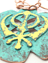 Este collar posee como pieza principal que es un mandala de cobre, luego se le soldo el Adi Shakti que es de cobre y se calo a mano, sobre la patina ( oxidación) del cobre se aplico hojilla de oro de 23 quilates. La cadena es hecha a mano en cobre.